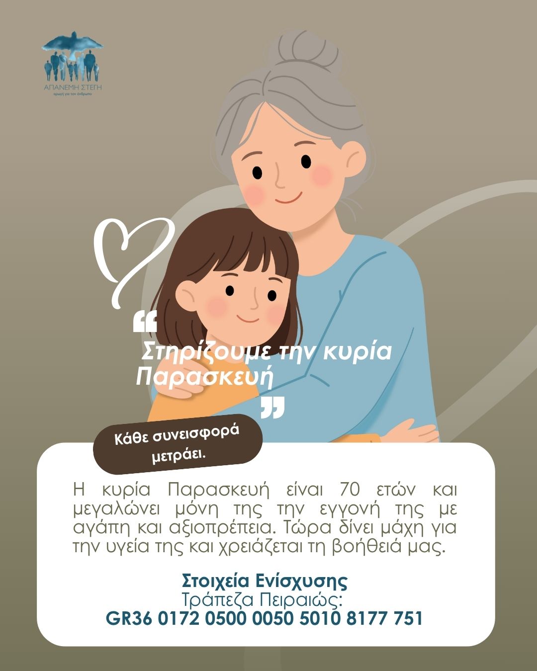 Κάθε συνεισφορά, μικρή ή μεγάλη, είναι πολύτιμη ώστε να μπορέσει να καλύψει τα έξοδα της θεραπείας της και να επιστρέψει δυνατή δίπλα στην εγγονή της — το μοναδικό της στήριγμα, καθώς οι γονείς του παιδιού δεν μπορούν να ανταποκριθούν στο καθήκον αυτό.